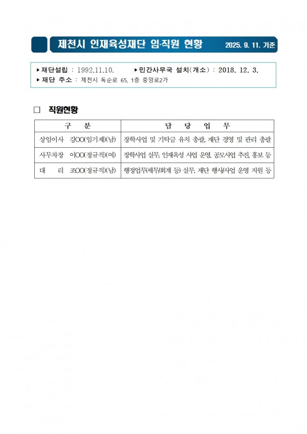 직원현황 직원현황(2025.9.11.기준) 페이지 정보 작성자 인재육성재단 댓글 0건 조회 664회 작성일 25-10-21 10:05 본문 직원현황(2025.9.11.기준) 목록 이전글임원현황(2025.9.11.기준) 25.10.21 다음글2025년 9월 업무추진비 내역 25.10.10 댓글목록 댓글목록 등록된 댓글이 없습니다.