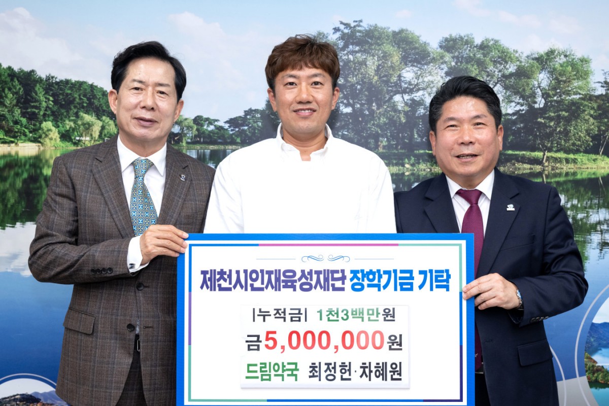 제천시 드림약국(대표약사 최정헌, 차혜원)이 13일 제천시인재육성재단(이사장 지중현)에 장학금 500만 원을 기탁했다.
