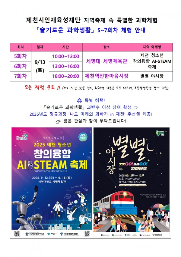 제천시인재육성재단 지역축제 속 특별한 과학체험 [슬기로운 과학생활] 5~7회차 체험 안내