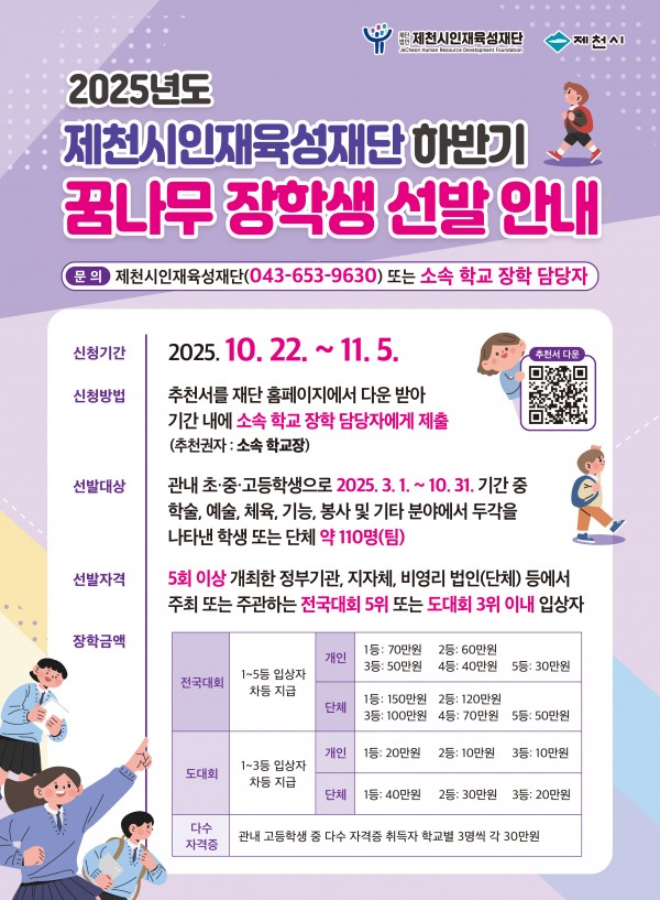 2025년도 제천시인재육성재단 하반기 꿈나무 장학생 선발 안내