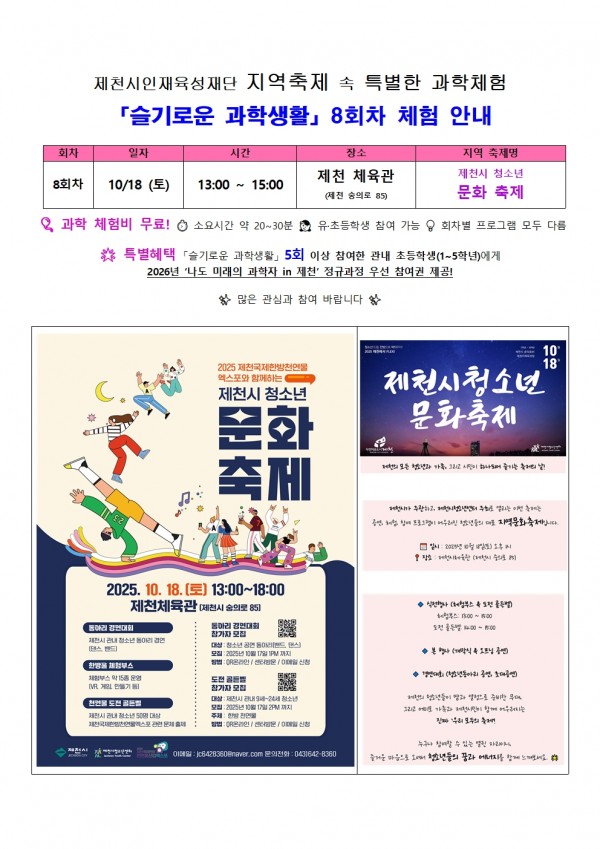 제천시인재육성재단 지역축제 속 특별한 과학체험(8회차) 안내