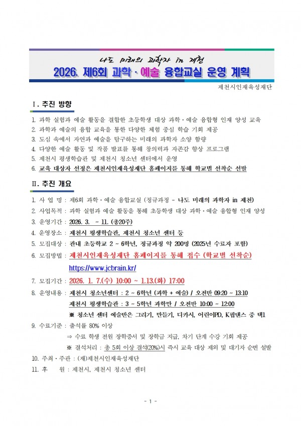 1. 사 업 명 : 제6회 과학·예술 융합교실 (정규과정 - 나도 미래의 과학자 in 제천)