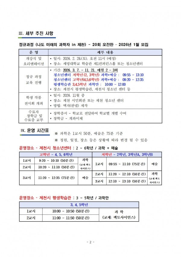 8. 운영내용 : 제천시 청소년센터 : 2 ~ 6학년 (과학 + 예술) / 오전반 09:20 ~ 13:10