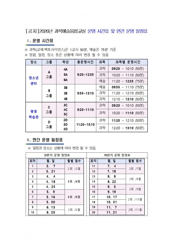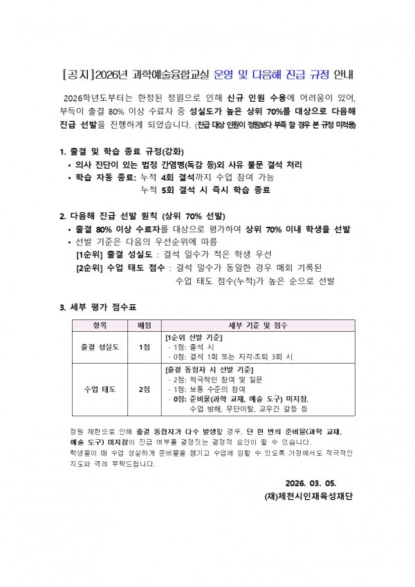 2026년 과학예술융합교실 운영시간, 연간 일정, 다음해 진급 규정 안내