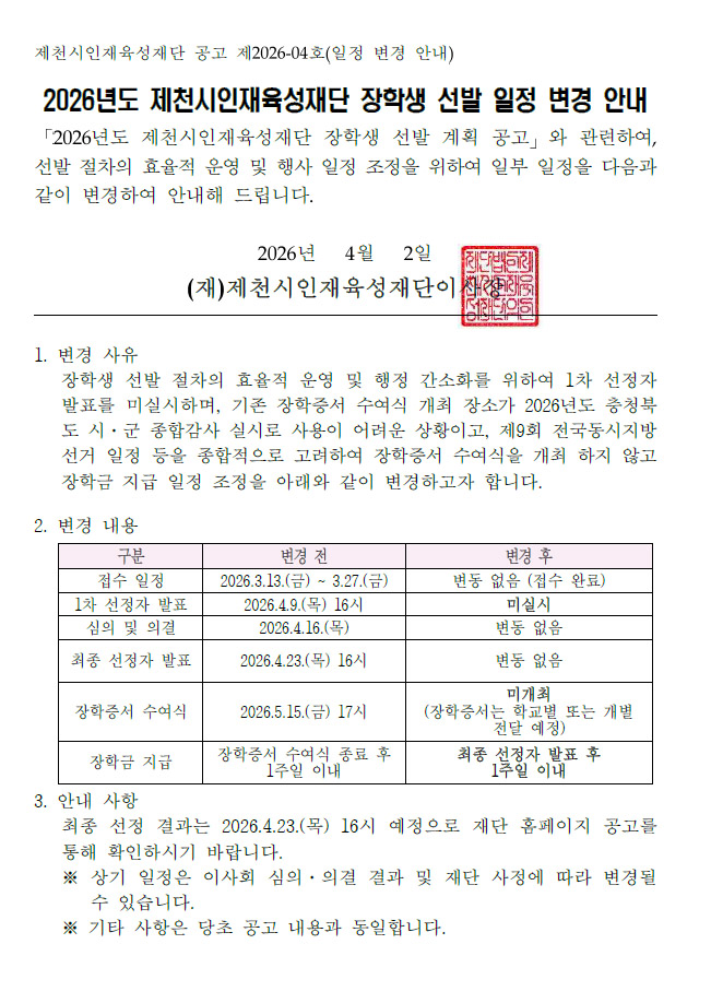 제천시인재육성재단 공고 제2026-04호(일정 변경 안내)